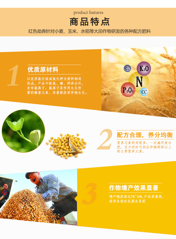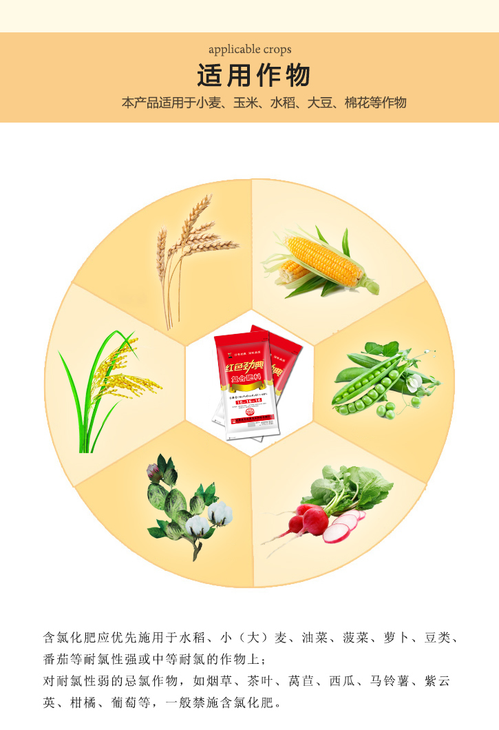 氯基复合肥施用范围广,产品配方合理,养分均衡.适用于小麦/玉米/水稻/大豆/棉花等耐氯作物.产品配方合理/养分均衡.增产效果显著.可作种肥/基肥/追肥.采用撒施/条施/穴施等施肥方式.
